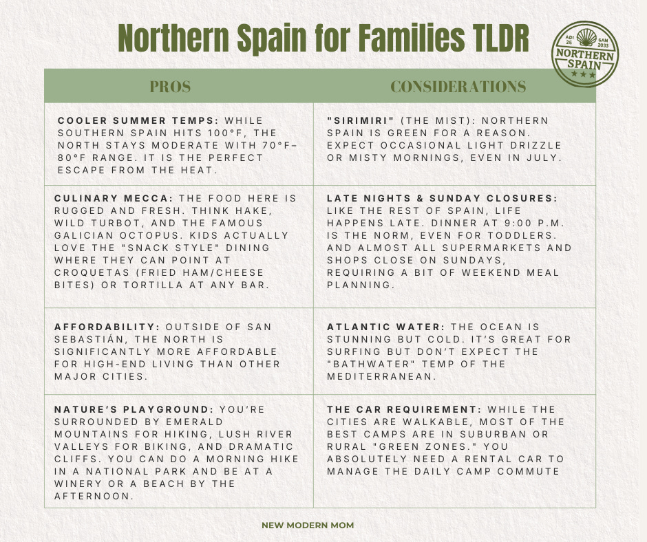 Cider & Txakoli: For the parents, the natural cider of Asturias and the effervescent white Txakoli wine of the Basque Country are non-negotiable summer staples.