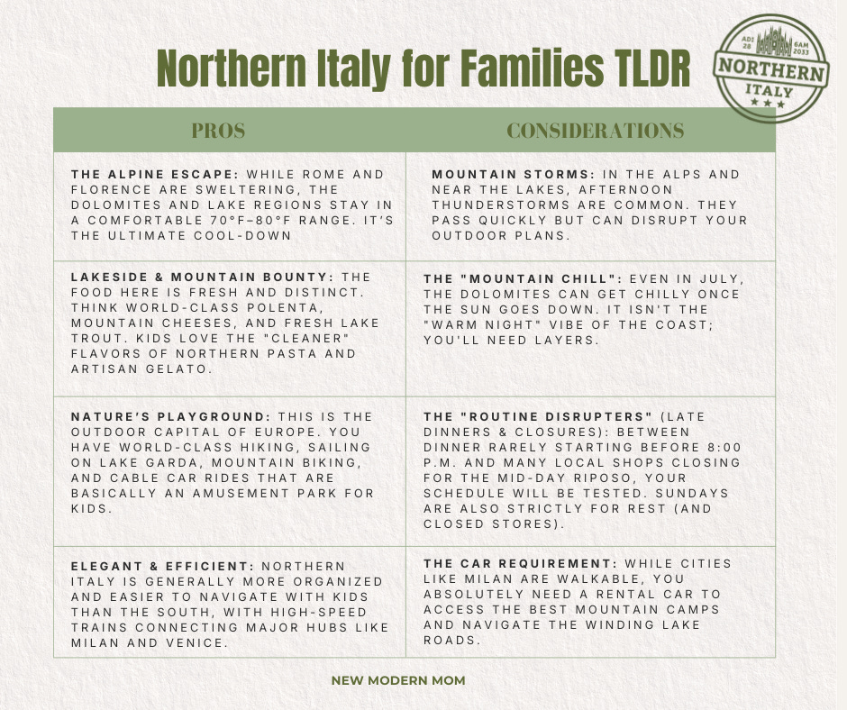 That is what makes Northern Italy feel so special. From the Dolomites to Lake Como to Milan, it offers a more livable summer with cooler temperatures and just as much charm.