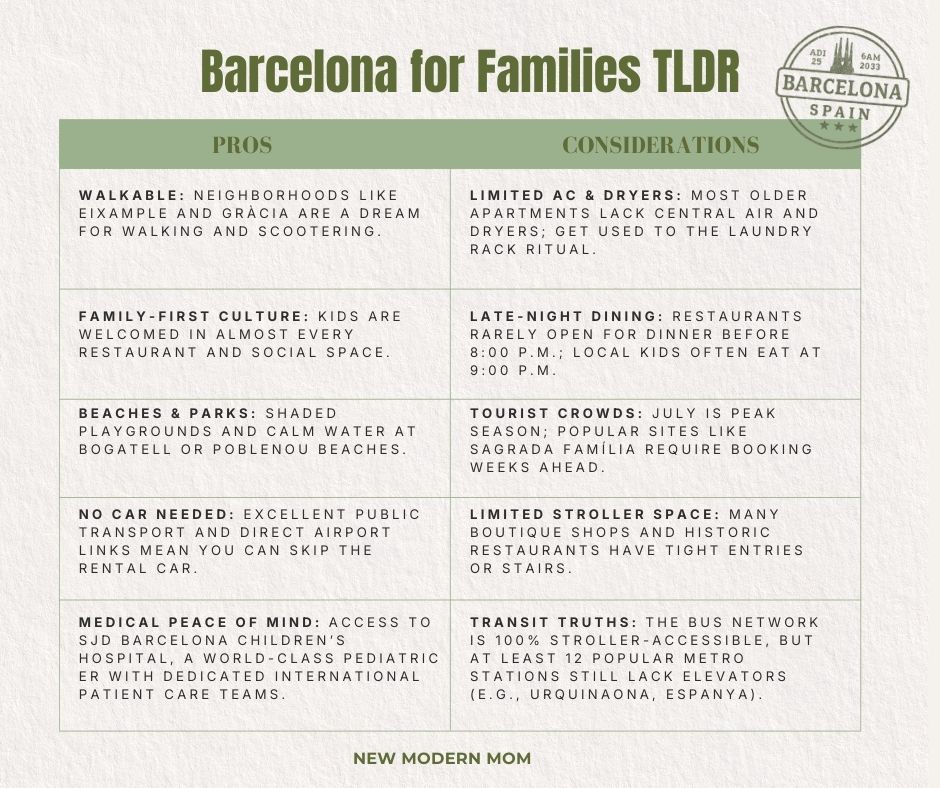 The Metro: While Barcelona is highly walkable and stroller-friendly, several main subway stations lack elevators so be prepared to fold up your stroller/carry your little one frequently.