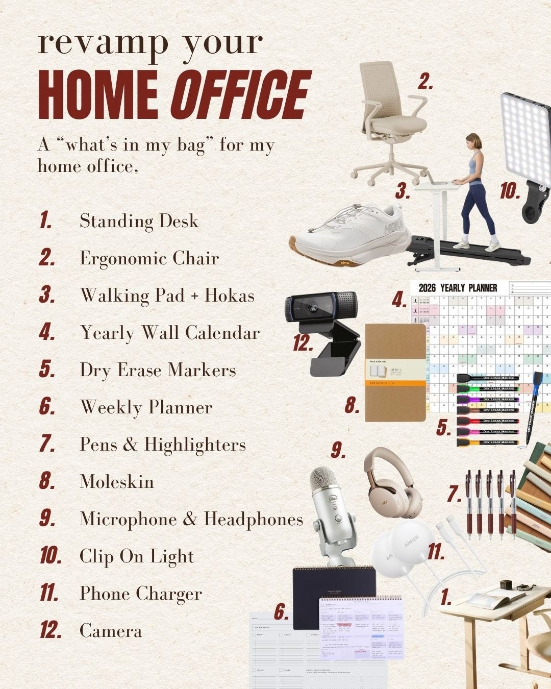Standing Desk, Ergonomic Chair, Walking pad + Hokas, Yearly Wall Calendar, Dry Erase Markers, Tear-Off Weekly Planner or Coiled Weekly Planner (if you work hybrid go for coiled), Best Pens, Aesthetic Highlighters, Moleskine, Microphone, Headphones, Clip on light, Phone charger, Camera
